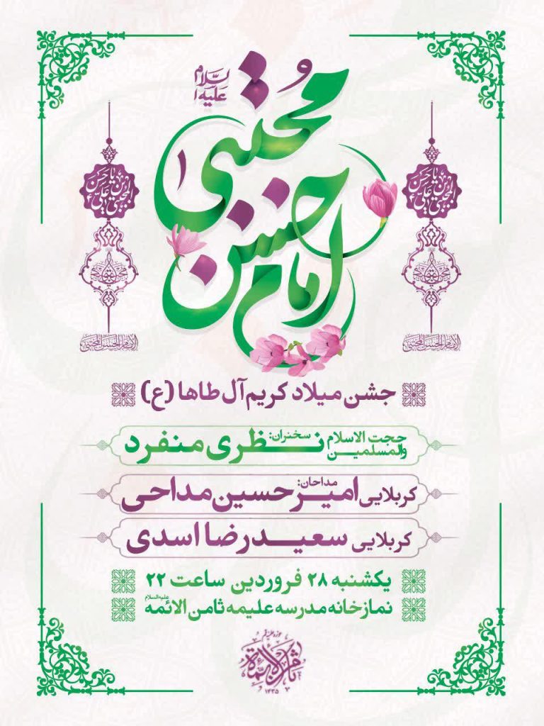 گزارش تصویری از جشن میلاد امام حسنمجتبی (علیه السلام) در تاریخ یکشنبه ۲۸ فروردین ماه ۱۴۰۱ در مدرسه علمیه ثامن الائمه(علیه السلام)، با سخنرانی حجتالاسلام والمسلمین نظریمنفرد و مدیحه سرایی کربلایی امیرحسین مداحی و کربلایی سعیدرضـــا اســـدی